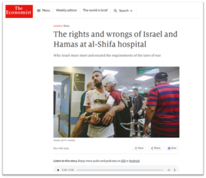 أخذت قضايا القتل والدمار أبعادًا كبيرة في القتل، ومسّت المستشفيات. وبيّنت العديد من التقارير التي صدرت في الصحافة المكتوبة الأجنبية منها إيكونوميست بكون “حماس استخدمت المستشفى كقاعدة عسكرية، وهو ما يبدو أن حماس ما تفعله، هو جريمة حرب”. والأكثر من ذلك أنها تُشرعن الهجوم على المستشفى بالقول: “إن قوانين الحرب تقرّ أنه بمجرد أن يتم استخدام المستشفى منشأة عسكرية، فإن ذلك يُفقدها الحماية الخاصة”. كان في شرعنة واضحة للهجوم الإسرائيلي على المستشفى، لتصل في خلاصة تقريرها إلى أن “كل ما سبق يرجح أن مستشفى الشفاء يُعد هدفًا عسكريًا مشروعًا للجيش الإسرائيلي”.