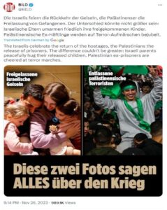 | صورة تظهر أحد الأطفال الفلسطينيين المفرج عنه من سجون الاحتلال في لحظة وصوله واستقباله من الأهالي الذين احتفوا به كأسير محرر، اختيار الصورتين ضمن هذه الظروف المختلفة قد ينطوي على تحيز مسبق في القرار التحريري، تظهر حميمية لقاء أهالي الأسرى الإسرائيليين بذويهم، وتجاهلت الجانب الفلسطيني مع التركيز فقط على الصور التي تظهر الأسرى حاملين لإعلام حماس. فالرغبة من هذه الصورة تقديم الأسرى المحررين والرافعين لرايات حركة المقاومة الإسلامية مؤشرا بأن تجمعات استقبال الأسرى المحررين في الضفة الغربية هي مظاهرات داعمة للإرهاب. | صورة حول تبادل الأسرى، وتقديم الأسرى في صورة مختلفة. واحدة مرتبطة بالعائلة الإسرائيلية وأخرى مرتبطة بأطفال حماس. | صحيفة بيلد الألمانية | 27 نوفمبر 2023