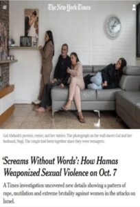 | نشرت صحيفة نيويورك تايمز الأمريكيّة تقريرا مطولا من 3500 كلمة تتبيّن فيه شهادات مروّعة لإسرائيليين حول اعتداءات ذات طبيعة جنسيّة، قام بها مسلحون فلسطينيون في السابع من أكتوبر الماضي في العمليّة التي عرفت باسم “طوفان الأقصى”. عنوان وصورة ملفتة للانتباه، الغاية منها كسب تعاطف القارئ عبر الجانب الجندري كي تظهر صورة المغتصب بأبشع صوره وأهمّها الحيوانيّة.